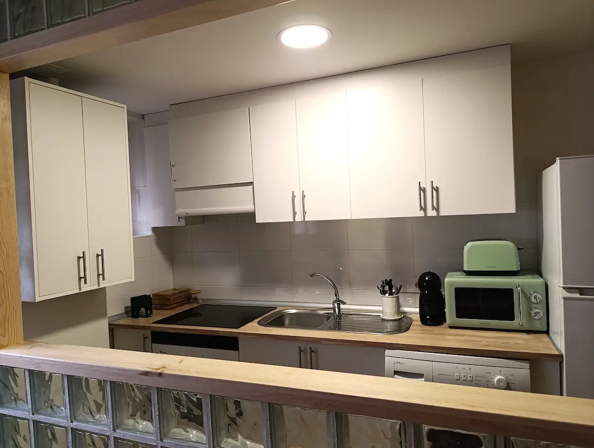 - Cocina totalmente equipada, microondas, cafetera Dolce Gusto, tostador, frigorífico y lavadora.